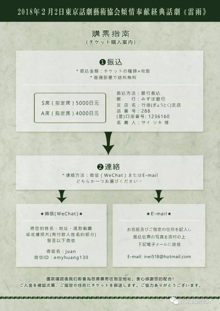 诚挚感谢各界人士对东京话剧艺术协会的大力支持与关注。明年是《中日和平友好条约》缔结40周年,为了促进中日民间艺术交流,为了丰富在日华人文化艺术生活,同时加深两国人民的友好关系,东京话剧艺术协会定于2018年2月2日公演话剧《雷雨》全剧。欢迎各界人士前来观演,全体协会成员敬候各位的光临!