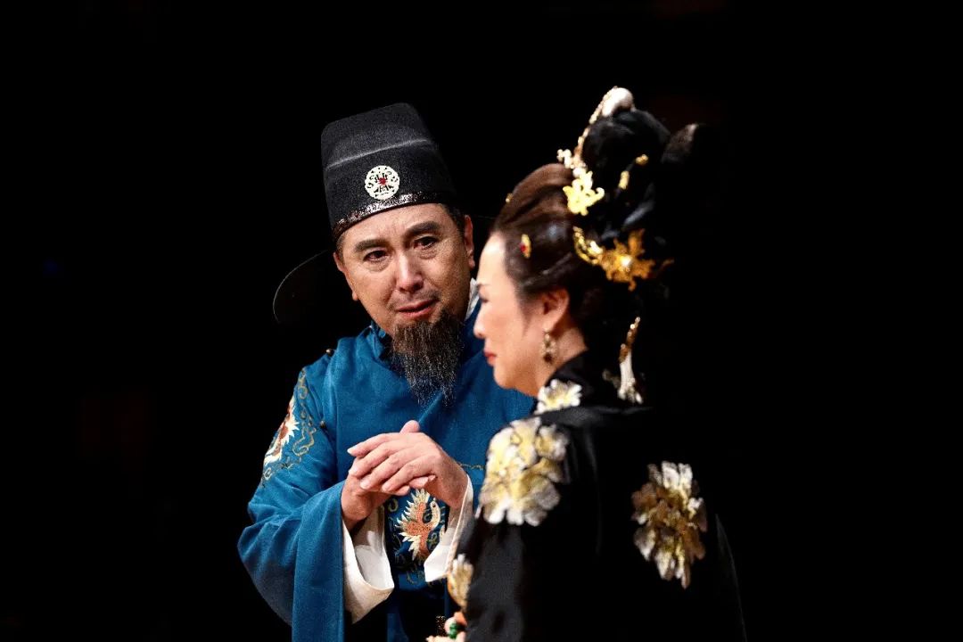 其次,上官仪饰演者程波与褚遂良饰演者蒋丰,二者将台词演绎得淋漓尽致,语气语调拿捏精准,转换上乘,句句贯耳。他们登台时间并不多,却用几句台词将角色演活了,观众数次被打动。剧中的宰相上官仪,为高宗起草废后诏书而背锅成了替罪羊,在被拉下去问斩之际,吟唱起《故北平公挽歌》,那场景令人动容。才思敏捷、文采过人的上官仪这一角色,非常适合程波饰演,程波曾是中国歌剧舞剧院专业演员,舞台经验丰富,特别是吟唱挽歌的那段表演,音调顿挫抑扬,可谓他的本色演出,尤其是“远气犹标剑,浮云尚写冠”那句绝唱,表达出上官仪对已故宰相北平公高尚品德和美好过往的怀念,以及自己当下的悲伤之情。剧中褚遂良的饰演者蒋丰,他本是一位常年从事媒体工作的主编、每天东奔西跑的记者,因此他在话剧《武则天女皇》中的表演之精彩超出了想象,台词竟然那么娴熟,铿锵有力,节奏清晰,而且他的表演用情至深,极富感染力。剧中褚遂良极力反对唐高宗废黜王皇后而上奏无效,饰演者蒋丰那句痛彻心扉的台词“恳请陛下让臣的骸骨得归故里”, 赢得观众雷鸣般的掌声。蒋丰饰演如此成功,跟他对褚遂良这个角色的深入了解与研究有关。据说蒋丰接受这个角色之后,几次自费飞回中国寻找褚遂良的足迹,从杭州窑瓶巷、丹阳东褚村、湘乡褚公祠,到桂林开元寺褚遂良书法无字碑,他花费了大量精力去吃透宰相褚遂良这一角色,才使得他在《武则天女皇》中有不同凡俗的舞台表现。