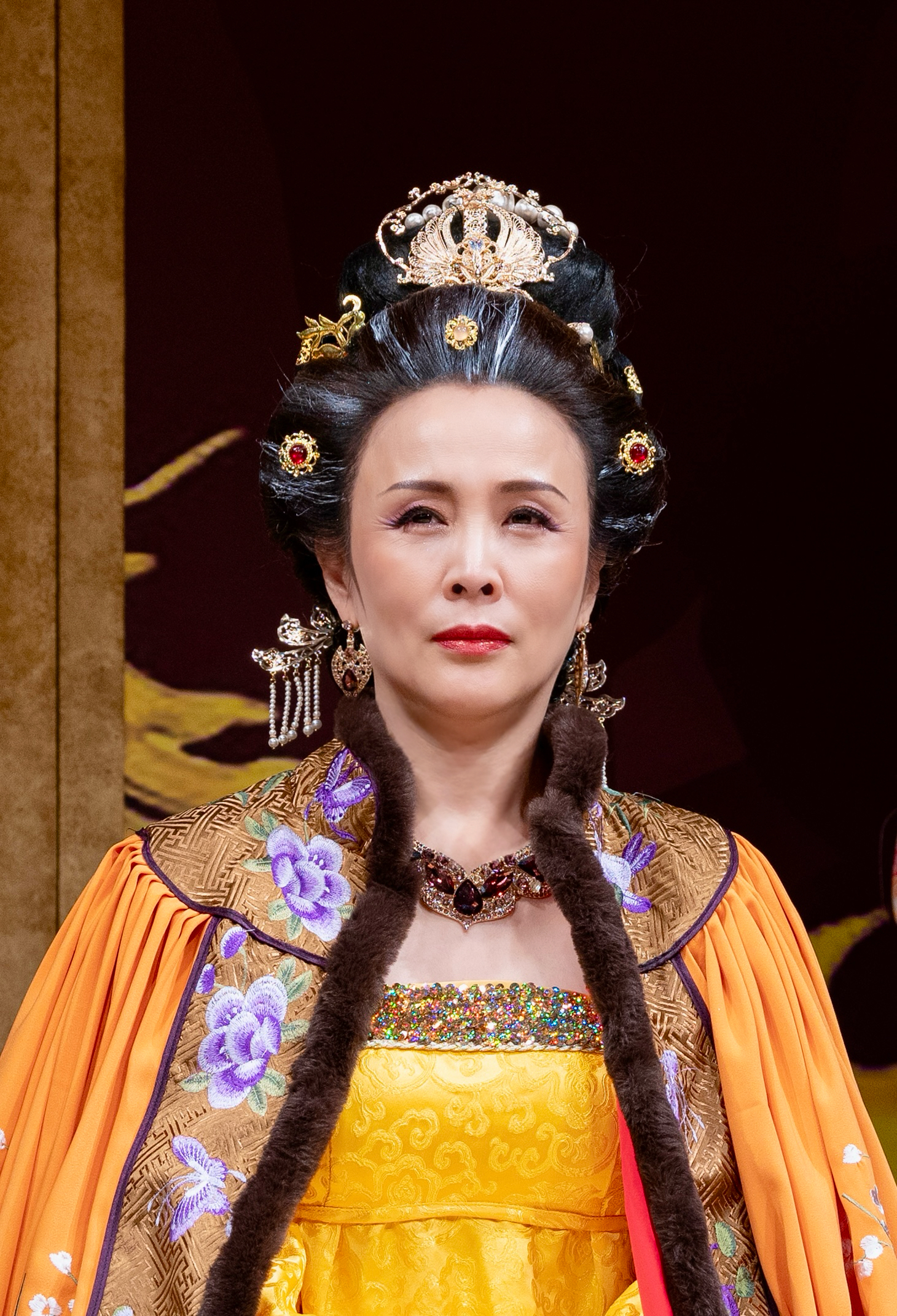 孙萍:正如你所提到的,组织这样规模的演出确实面临诸多挑战。整个剧目包含了16个主要场景和一个尾声,共17场戏。在一些大型场面中,近20位演员同时登台,对灯光、道具、音效、化妆和服装等各个部门提出了很高的要求。去年八月,在最为炎热的季节,我们开始进入排练,尽管高温难耐,演员们还是坚持穿着代用服进行排演。为了精确掌握武则天这一角色,我们准备了七套不同的服装,从才人到皇后再到皇帝,每一次角色转变都伴随着服装和头饰的更换,化妆和服装的工作量巨大。