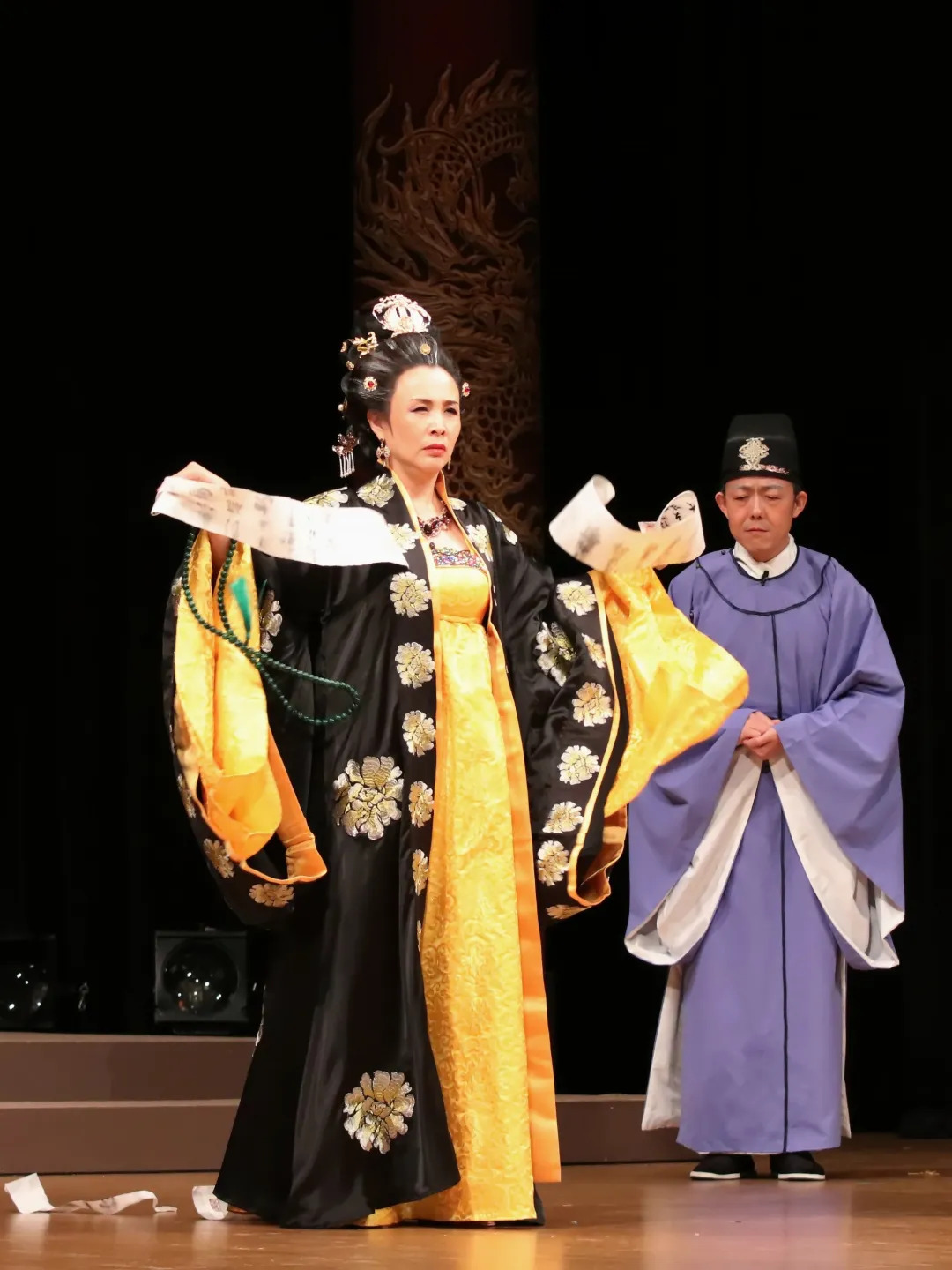 凌老师:当然可以。这本书以《武则天女皇》的剧本为基础,包含中日文版本,以及剧组主要演员的排练感想、采访录和剧评。全书共288页,配有彩色剧照。其中还包含一部分由扮演褚遂良的蒋丰老师所写的文章,他为了更好地塑造角色,走访了褚遂良的出生、任职以及重要活动的地点,通过实地考察和采访收集了很多珍贵的资料,撰写了一系列既富有历史价值又极具可读性的文章。此外希望读者能通过这本书深入了解《武则天女皇》在创作过程中的故事。