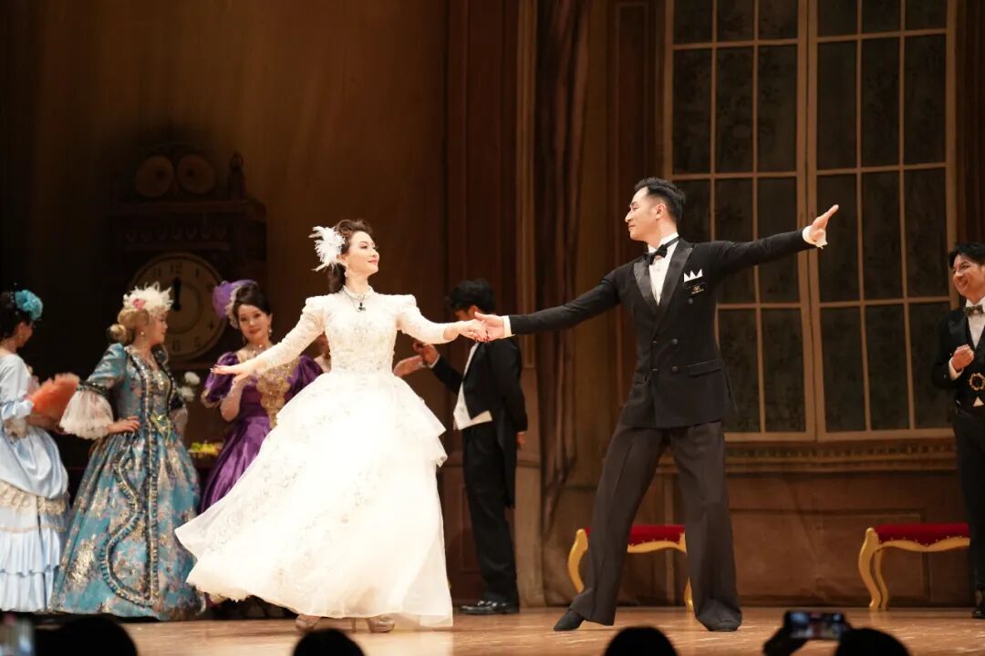 大幕初启的舞蹈场面构图宏大,由在日著名舞蹈演员及舞蹈教育家赵淳设计全剧的舞蹈场面,并亲自登台与玛格丽特共舞。灯光投射下群舞队形如波浪般铺陈,瞬间锁住观众视线。舞蹈不仅作为视觉装饰,更承担着揭示人物情绪与预示悲剧命运的叙事功能。