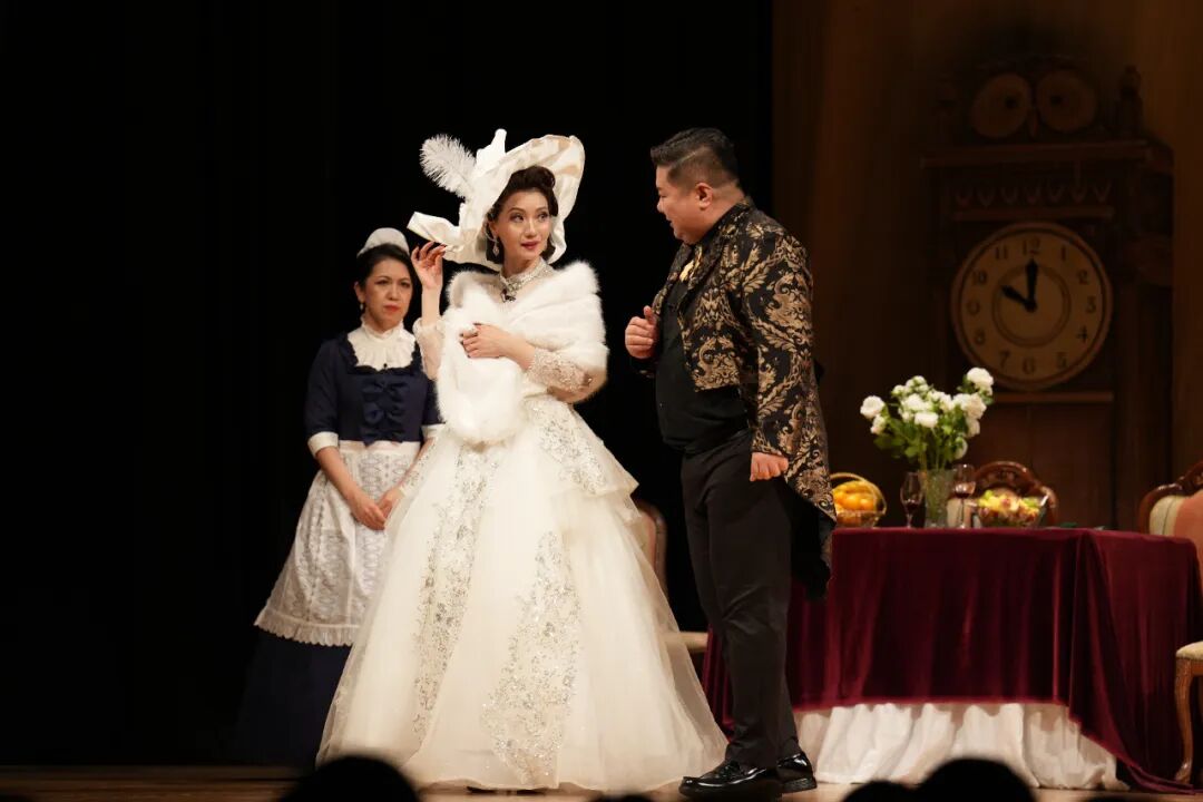 舞台布景从巴黎沙龙的金碧辉煌,到玛格丽特寓所的静谧优雅,都精心构思。家具摆设、花艺造型、人物服饰无不讲究细节,使舞台呈现出一种真实而富有品味的古典气息。